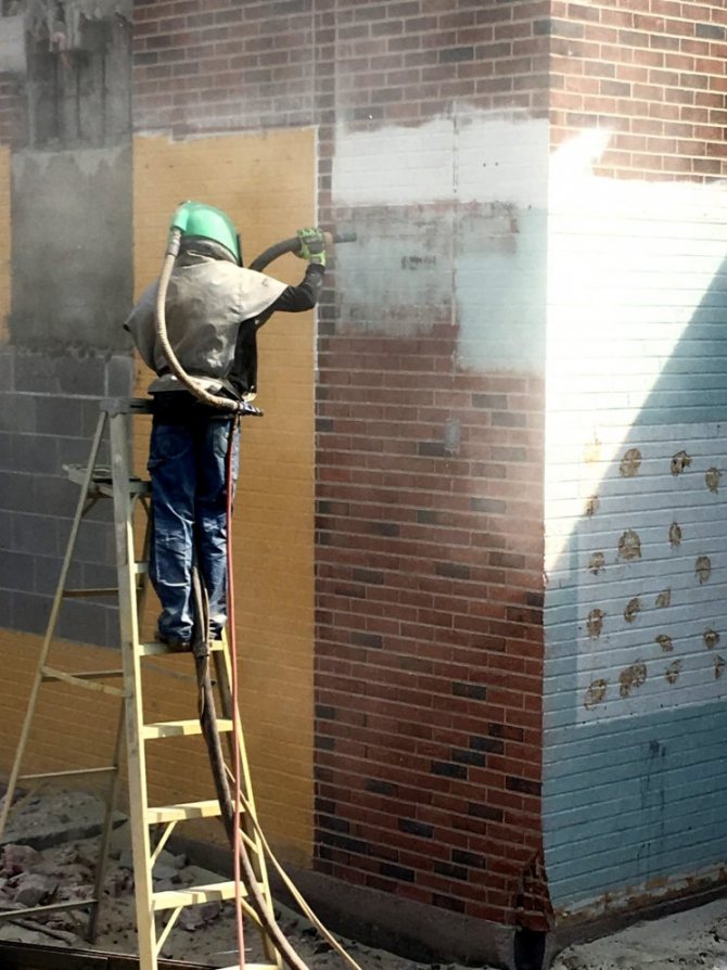 Отчистка кирпичных и др.видов фасадов производится аппаратом с подачи воды под высоким давлением и пескоструйным оборудованием с различным давлением.
